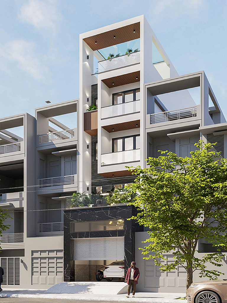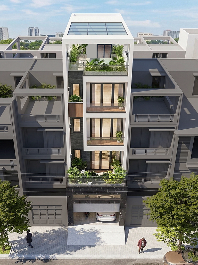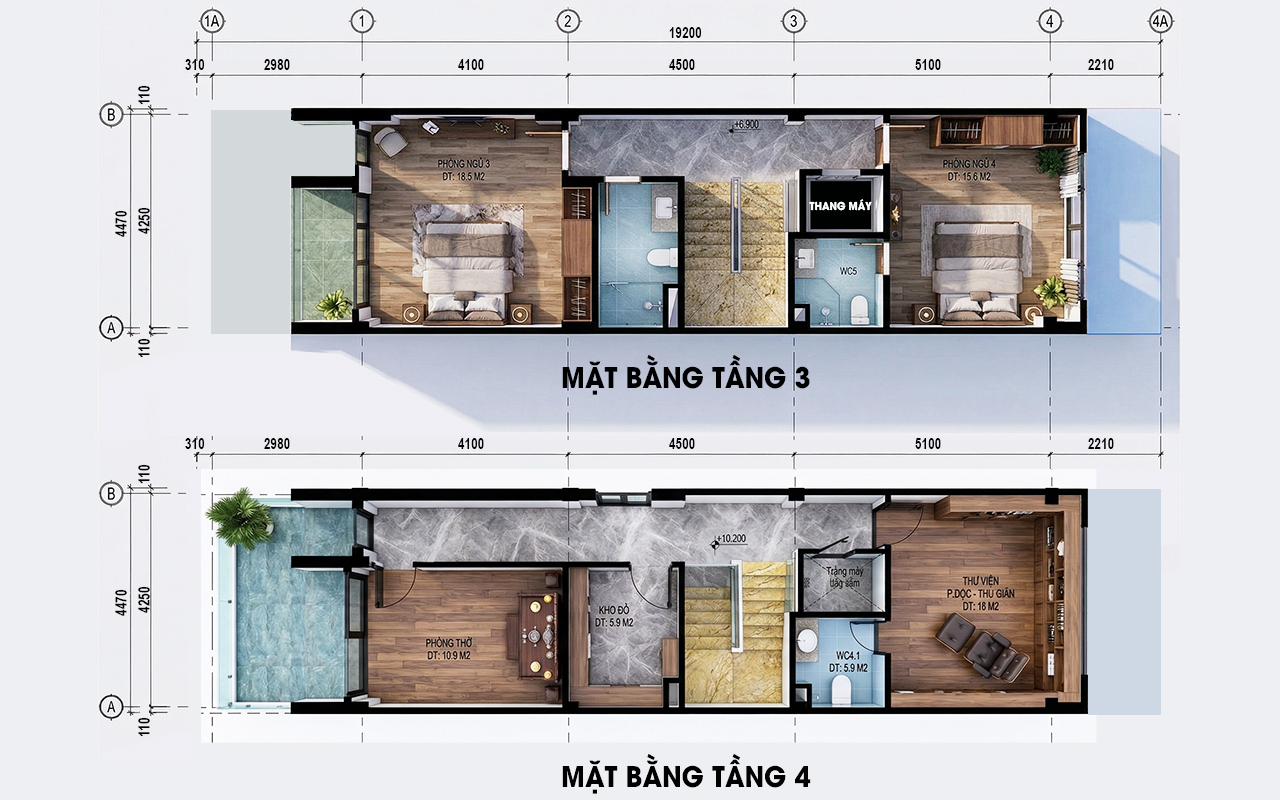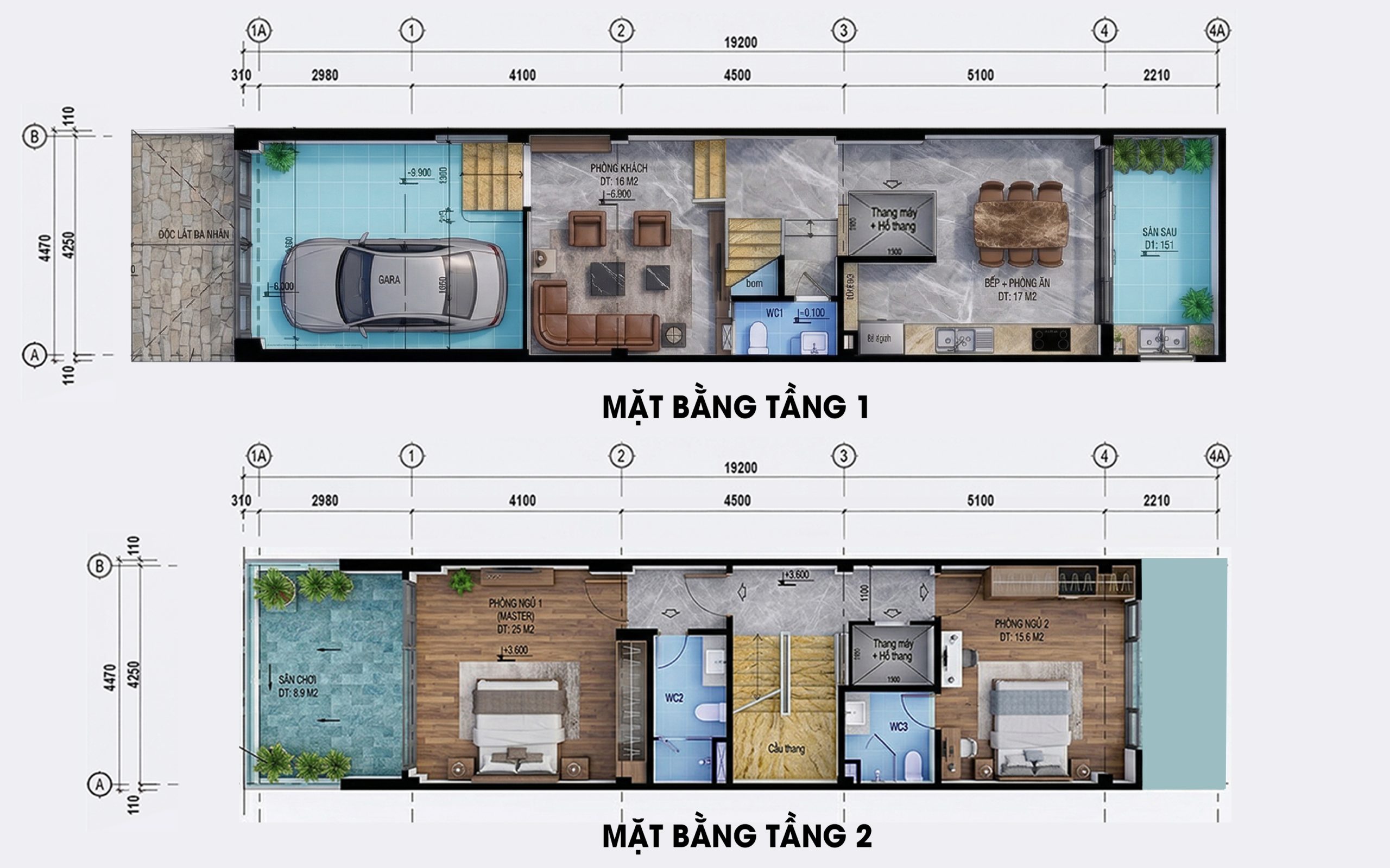 Tầng 2 là không gian nghỉ ngơi riêng tư với 2 phòng ngủ khép kín tiện nghi. Phòng ngủ Master chiếm vị trí ưu tiên phía mặt tiền, kết nối trực tiếp với sân chơi rộng thoáng – vừa là khoảng đệm xanh, vừa là nơi thư giãn lý tưởng. Phòng ngủ phía sau cũng sở hữu vệ sinh riêng biệt, đảm bảo sự độc lập tuyệt đối. Lõi giao thông thang máy và thang bộ được xử lý gọn gàng, giúp hành lang dẫn vào các phòng luôn mạch lạc và tối ưu diện tích sử dụng.