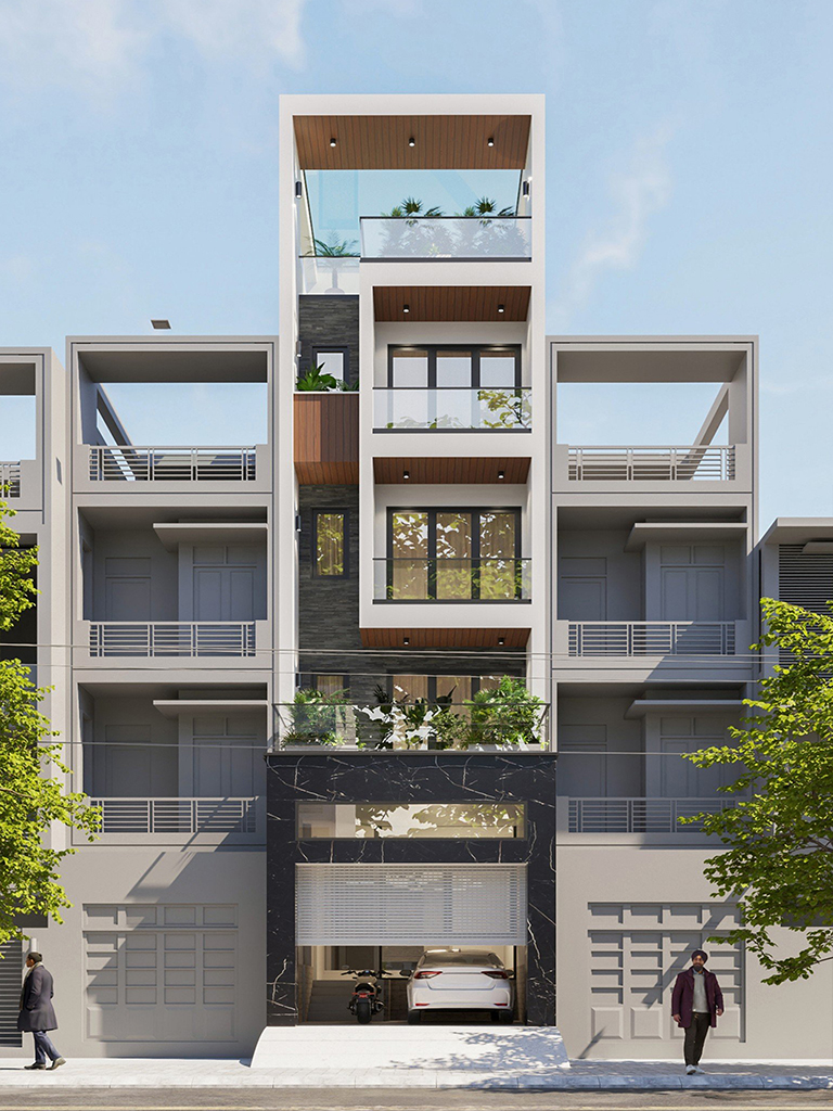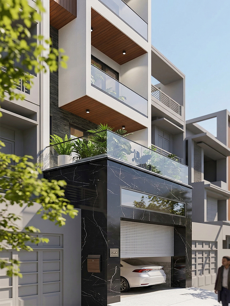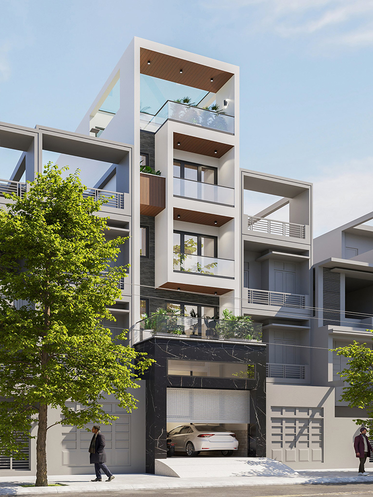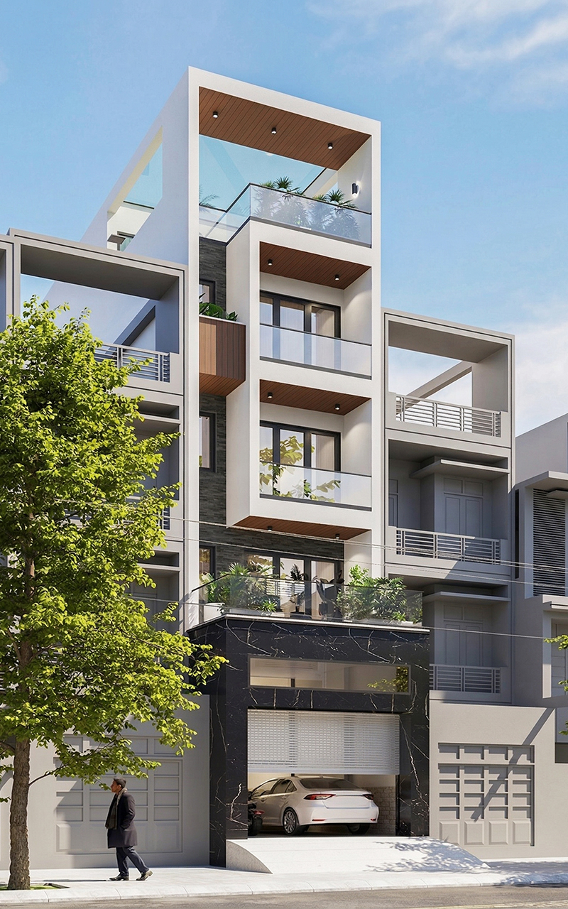 Tầng 1 được quy hoạch theo trục dọc thông thoáng, bắt đầu từ khu vực Gara xe rộng rãi phía trước. Không gian tiếp nối là Phòng khách hiện đại, liên thông trực tiếp với Bếp và Phòng ăn nhằm tối ưu hóa diện tích sinh hoạt chung. Điểm nhấn là hệ thống thang máy kết hợp thang bộ được bố trí trung tâm, giúp giao thông giữa các tầng trở nên thuận tiện. Phía cuối nhà là sân sau lấy sáng, đảm bảo sự đối lưu không khí xuyên suốt cho toàn bộ tầng trệt.