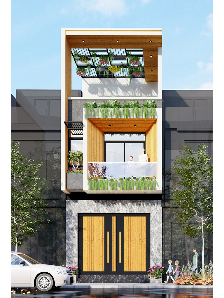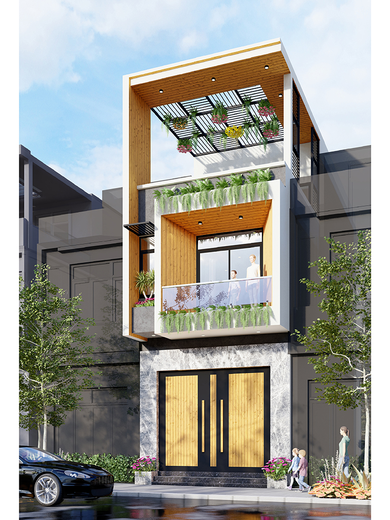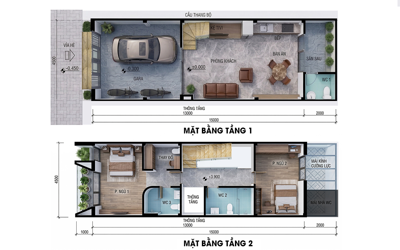 Tầng 1 được thiết kế tối ưu với khu vực Gara xe rộng rãi phía trước, đủ chỗ cho ô tô và xe máy. Không gian bên trong là sự kết nối mở giữa Phòng khách và Bếp ăn, tạo cảm giác thông suốt và rộng rãi cho chiều dài nhà phố. Cầu thang bộ được bố trí sát tường giúp tiết kiệm diện tích. Phía cuối nhà là khu vực Sân sau và vệ sinh chung, đảm bảo sự thông thoáng và lấy sáng tự nhiên cho toàn bộ tầng trệt.