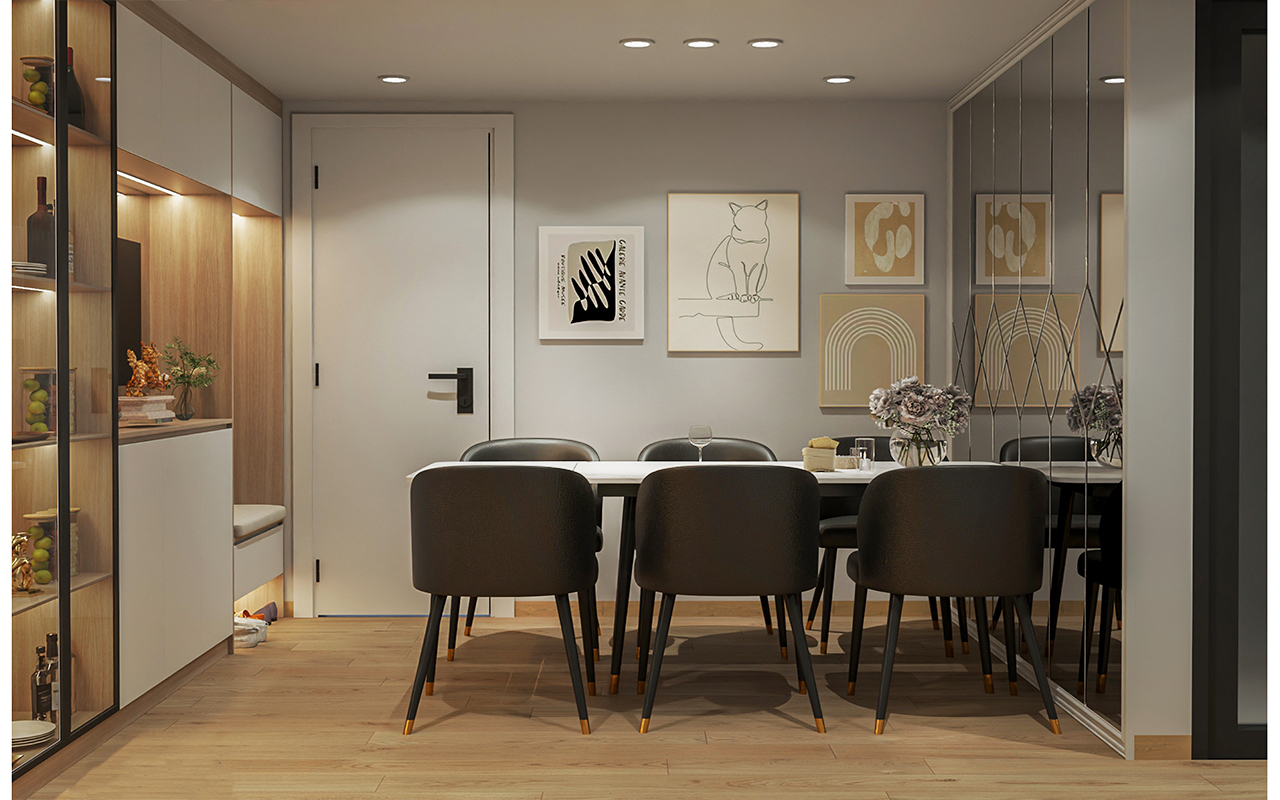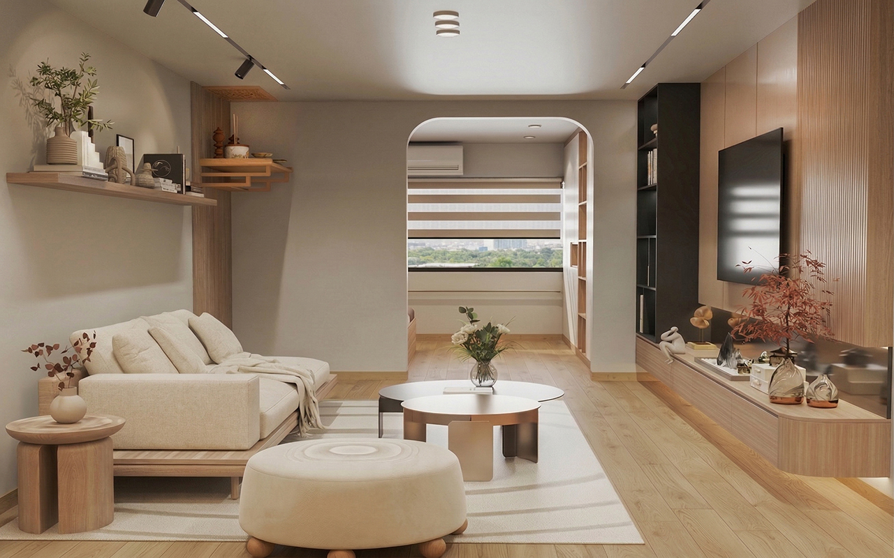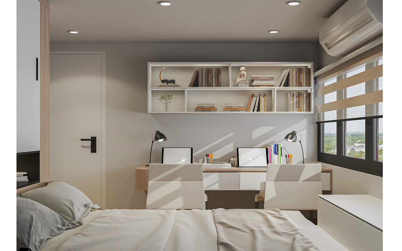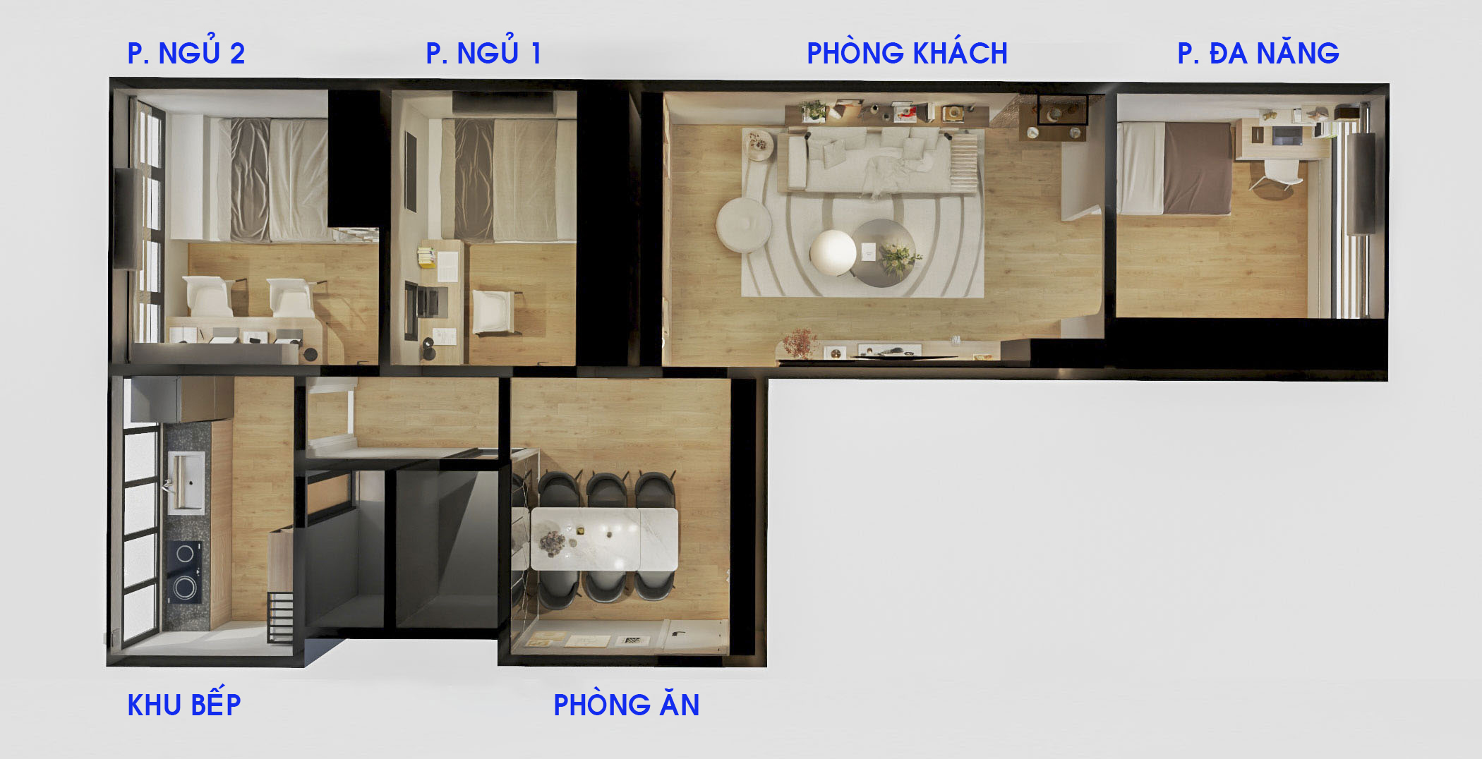 Căn hộ được tối ưu hóa theo lối thiết kế không gian mở, giúp xóa tan cảm giác chật hẹp của diện tích nhỏ. Khu vực trung tâm là sự kết nối mạch lạc giữa Phòng khách và Phòng ăn, trong khi Khu bếp được tách biệt sát cửa sổ để đảm bảo sự thông thoáng. Không gian nghỉ ngơi gồm 2 Phòng ngủ và 1 Phòng đa năng được bố trí dọc theo chiều dài căn hộ, tất cả đều tích hợp bàn làm việc sát cửa sổ để đón sáng tự nhiên. Việc sử dụng đồng nhất sàn gỗ sáng màu cùng nội thất tinh giản tạo nên một tổng thể hiện đại, ấm cúng và đầy đủ tiện nghi.