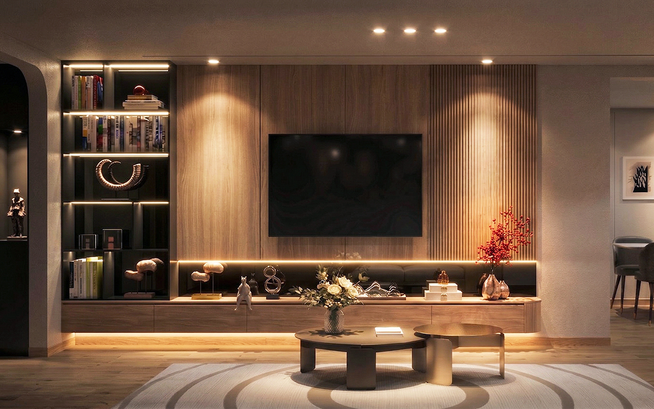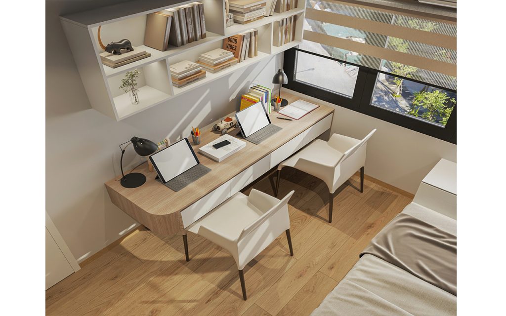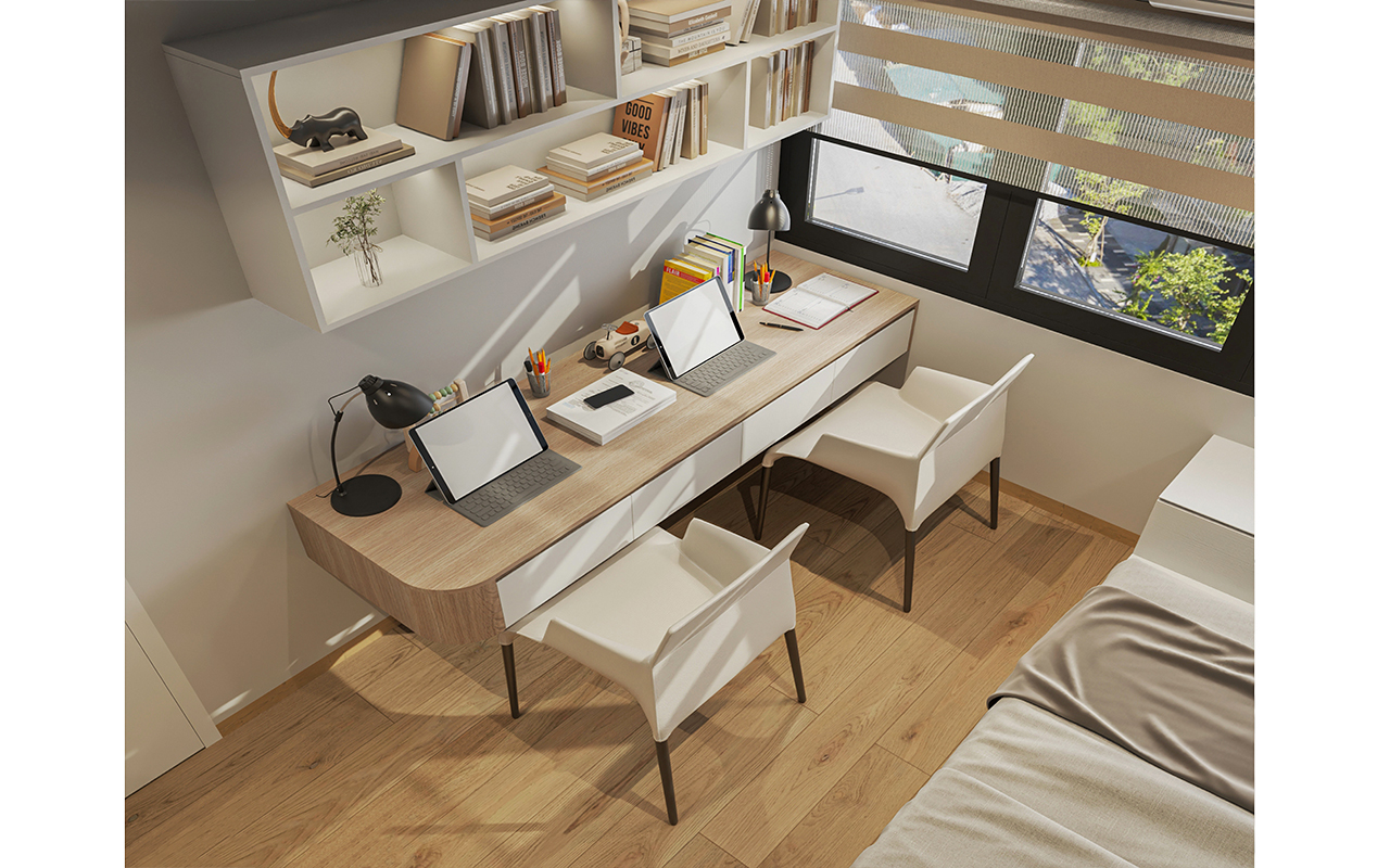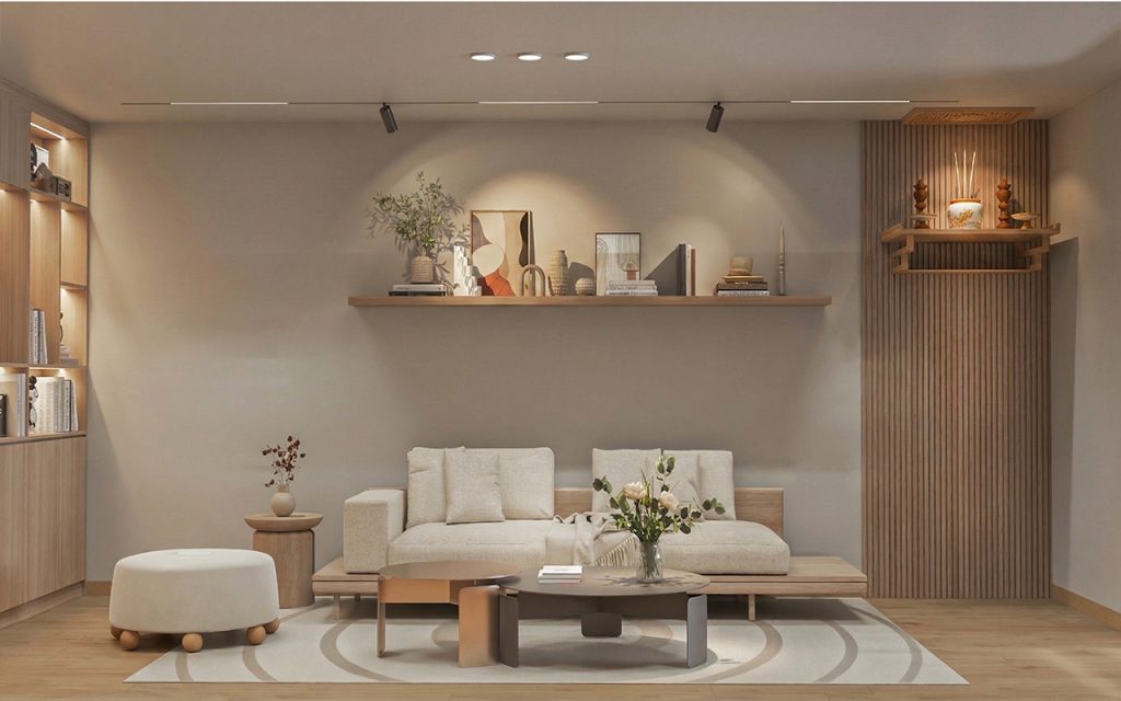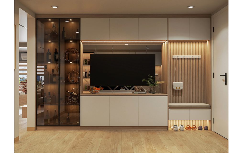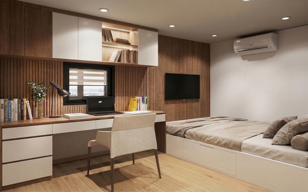 Căn hộ được tối ưu hóa theo lối thiết kế không gian mở, giúp xóa tan cảm giác chật hẹp của diện tích nhỏ. Khu vực trung tâm là sự kết nối mạch lạc giữa Phòng khách và Phòng ăn, trong khi Khu bếp được tách biệt sát cửa sổ để đảm bảo sự thông thoáng. Không gian nghỉ ngơi gồm 2 Phòng ngủ và 1 Phòng đa năng được bố trí dọc theo chiều dài căn hộ, tất cả đều tích hợp bàn làm việc sát cửa sổ để đón sáng tự nhiên. Việc sử dụng đồng nhất sàn gỗ sáng màu cùng nội thất tinh giản tạo nên một tổng thể hiện đại, ấm cúng và đầy đủ tiện nghi.